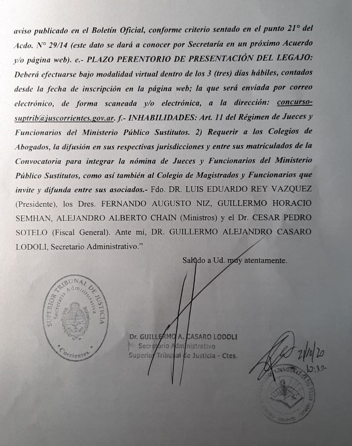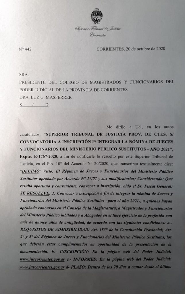 El Superior Tribunal de Justicia de la Provincia de Corrientes abre la convocatoria a inscripción para integrar la nómina de jueces y funcionarios del ministerio público sustitutos años 2021, a quienes hayan aprobado concurso en el Consejo de la Magistratura, a Magistrados y Funcionarios del Ministerio Público jubilados y Abogados en libre ejercicio de la profesión con más de 15 años de antigüedad, de acuerdo con las siguientes condiciones: