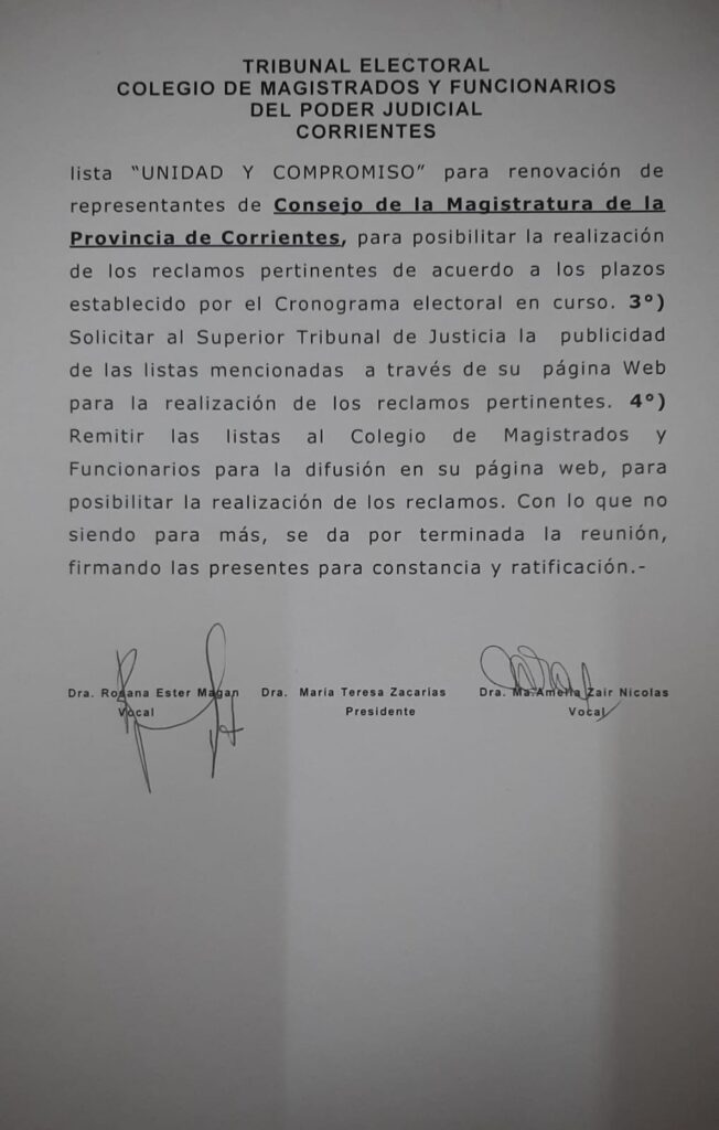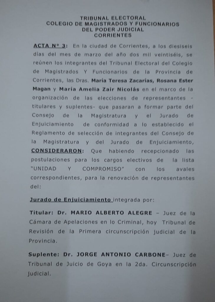 Acta N° 3 del Tribunal Electoral del Colegio de Magistrados y Funcionarios de la Provincia de Corrientes, compuesto por las Dras. Rosana Ester Magan, Maria Amelia Zair Nicolas y Maria Teresa Zacarias, resuelven: