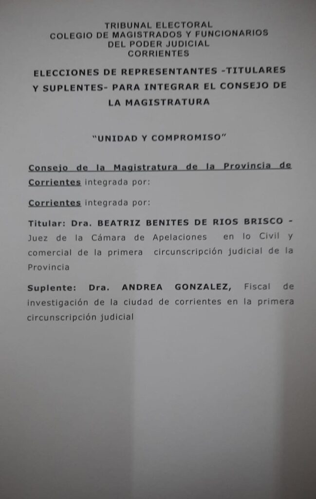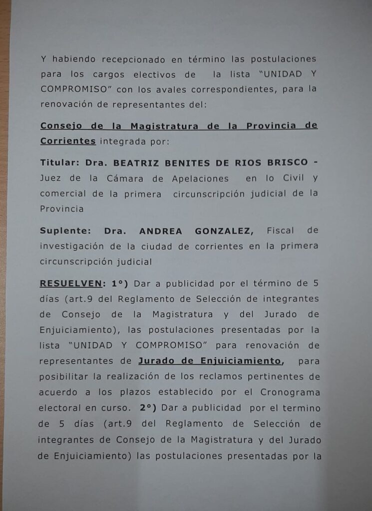 Dar publicidad por el término de 5 días para posibilitar la realización de los reclamos pertinentes de acuerdo a los plazos establecidos en el cronograma electoral en curso, las postulaciones presentadas por la lista “Unidad y Compromiso” para elegir representantes del Consejo de la Magistratura y el Jurado de Enjuiciamiento.