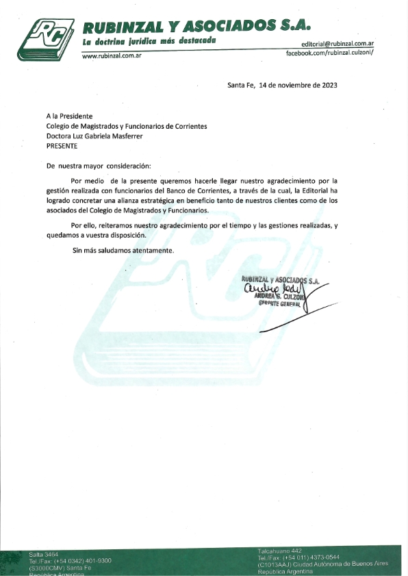 Gracias a gestiones realizadas por autoridades del Colegio, la Editorial Rubinzal y Asociados S.A logró concretar una alianza estratégica en beneficio de los Asociados al Colegio con el Banco de Corrientes.